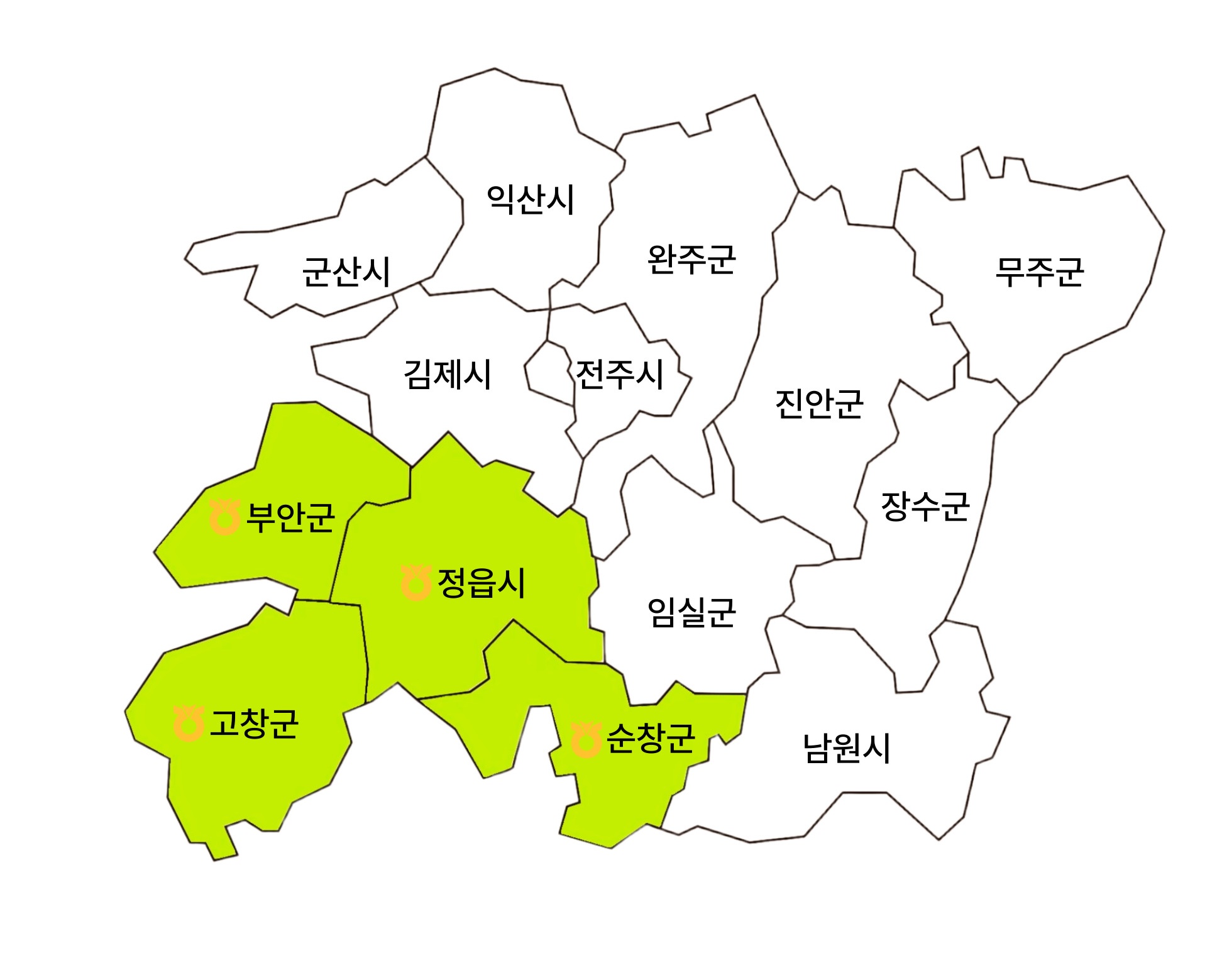 정읍원예농협의 관할구역은 정읍시, 부안군, 고창군, 순창군이며 지역 농업인의 영농활동과 유통을 밀착 지원하고 있습니다.